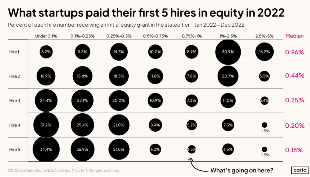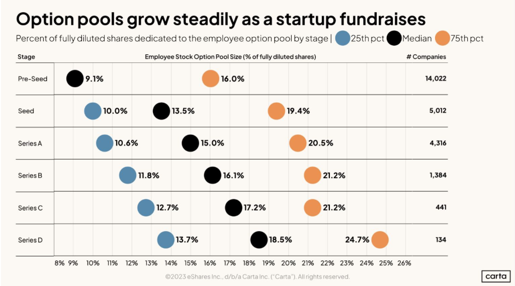 Um estudo recente do CARTA apresentou como empreendedores (da base de dados deles) ofertam ESOP para colaboradores e em quais momentos da empresa. Segue abaixo a imagem com os dados: