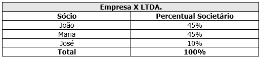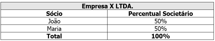 João e Maria são sócios em na Empresa X LTDA. São detentores de quotas iguais, no percentual de 50% cada um deles.